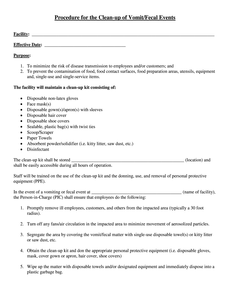 Procedure for the Cleanup of Vomit/Fecal Events Facility: Effective Date: Purpose: 1. To minimize the risk of disease transmission to employees and/or customers; and 2. To prevent the contamination