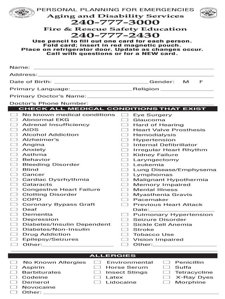 PERSONAL PLANNING FOR EMERGENCIESAging and Disability Services2407773000Fire & Rescue Safety Education2407772430Use pencil to fill out one card for each person. Fold card; insert in red magnetic pouch.