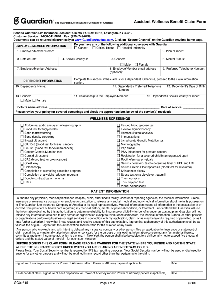 Send to Guardian Life Insurance, Accident Claims, PO Box 14315, Lexington, KY 40512