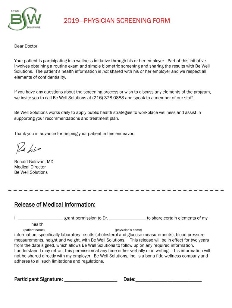2019 Physician Screening Form is not the form you're looking for?Search for another form here.