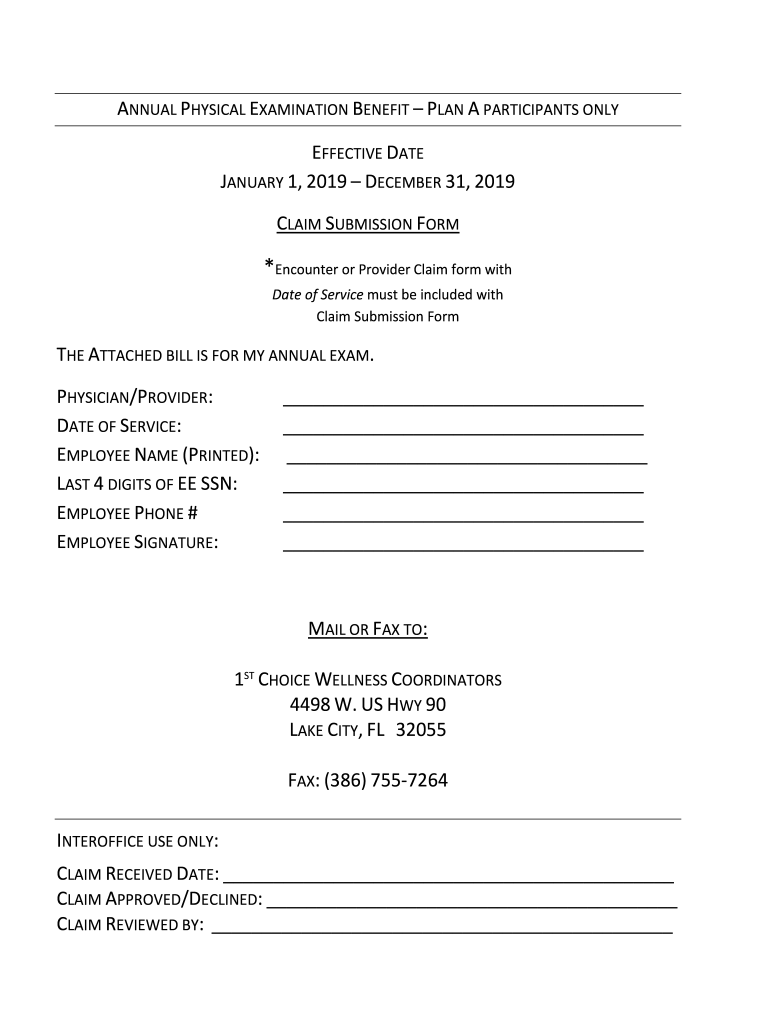 ANNUAL PHYSICAL EXAMINATION BENEFIT PLAN A PARTICIPANTS ONLY EFFECTIVE DATE JANUARY 1, 2019, DECEMBER 31, 2019, CLAIM SUBMISSION FORM×Encounter or Provider Claim form with Date of Service must be
