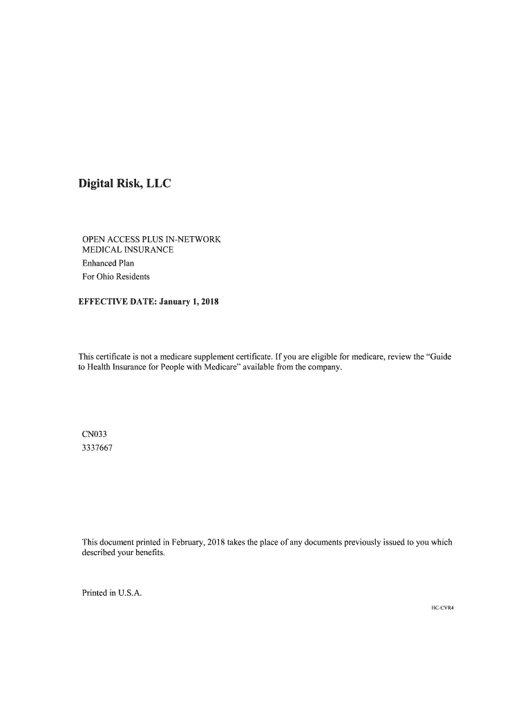 Digital Risk, LYCOPENE ACCESS PLUS NETWORK MEDICAL INSURANCE Enhanced Plan For Ohio Residents EFFECTIVE DATE: January 1, 2018This certificate is not a medicare supplement certificate. If you are eligible