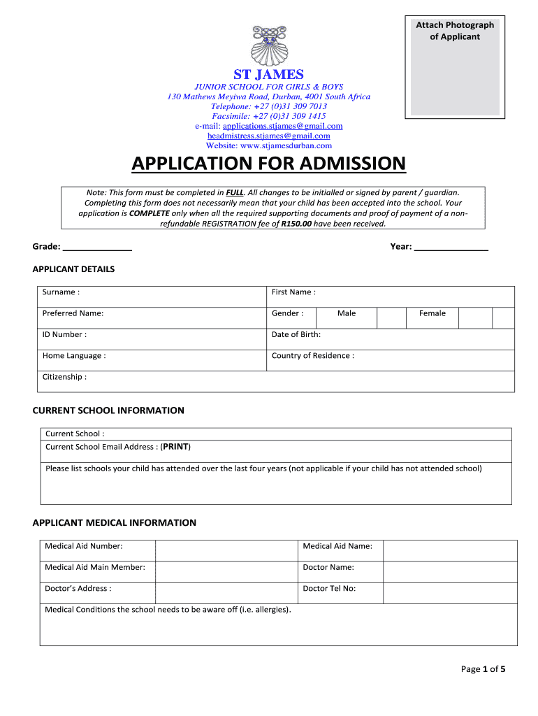 Attach Photograph of Applicants JAMES JUNIOR SCHOOL FOR GIRLS & BOYS 130 Mathews Maisey Road, Durban, 4001 South Africa Telephone: +27 (0)31 309 7013 Facsimile: +27 (0)31 309 1415 email: applications.