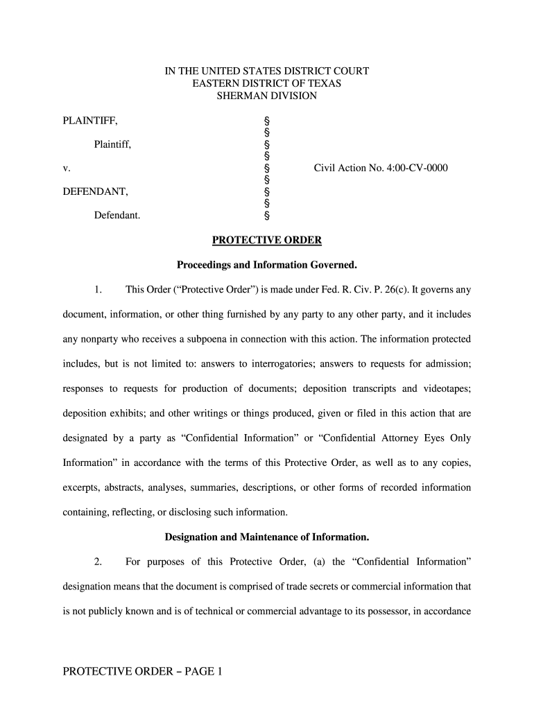 IN THE UNITED STATES DISTRICT COURT EASTERN DISTRICT OF TEXAS SHERMAN DIVISION 'PLAINTIFF, Plaintiff, v. DEFENDANT, Defendant. Civil Action No. 4:00CV0000PROTECTIVE ORDER Proceedings and Information