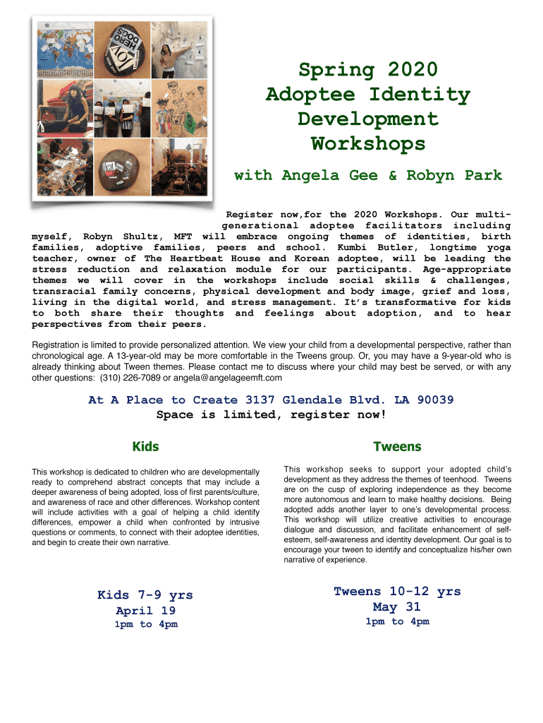 Spring 2020 Adopted Identity Development Workshops with Angela Gee & Robyn Park Register now, for the 2020 Workshops. Our multigenerational adopted facilitators including myself, Robyn Schultz, MFT