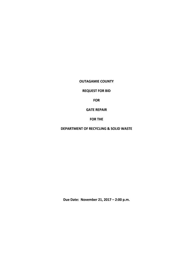 OUTAGAMIECOUNTY REQUESTFORBID FOR GATEREPAIR FORTH DEPARTMENTOFRECYCLING&SOLIDWASTE Debate:November21,20172:00p.m. 1.0 2.03.04.05.0 6.0ScopeofWork TheOutagamieCountyDepartmentofRecyclingandSolidWasteisseekingaqualified