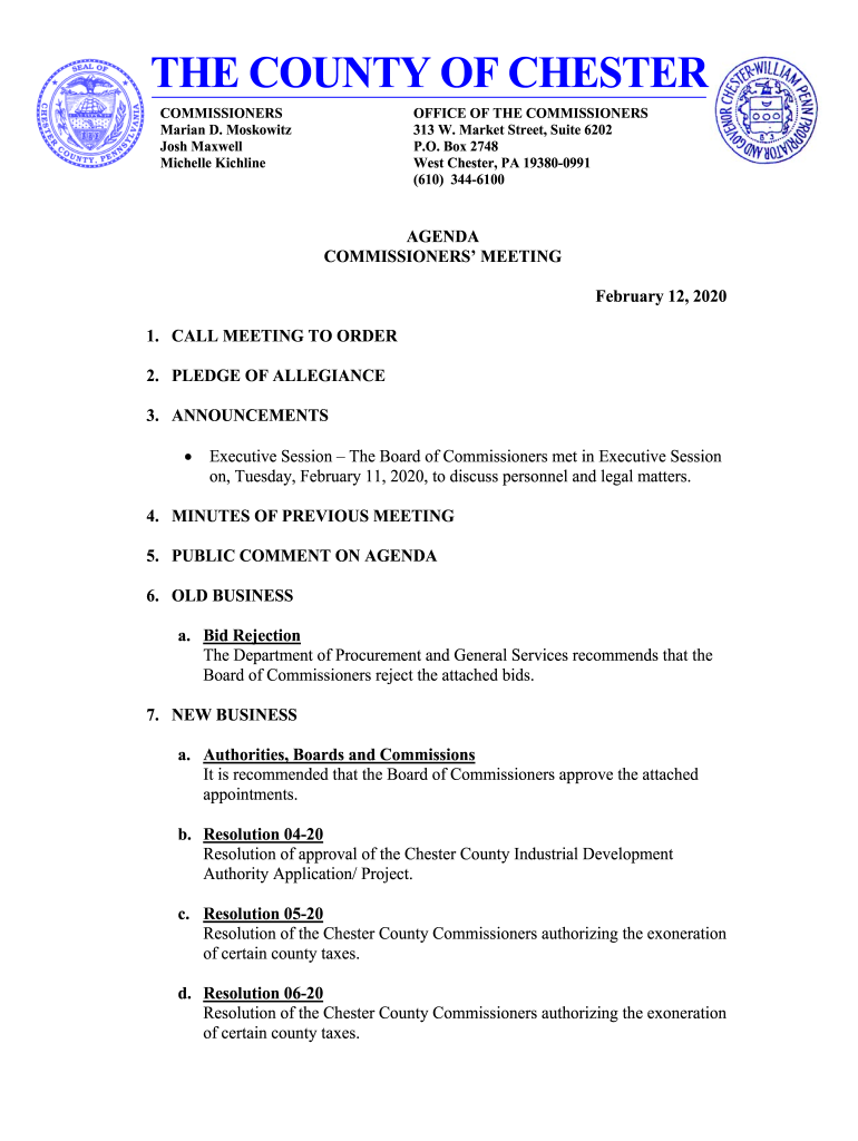 THE COUNTY OF CHESTER COMMISSIONERS Marian D. Moskovitz Josh Maxwell Michelle KichlineOFFICE OF THE COMMISSIONERS 313 W. Market Street, Suite 6202 P.O. Box 2748 West Chester, PA 193800991 (610) 3446100AGENDA