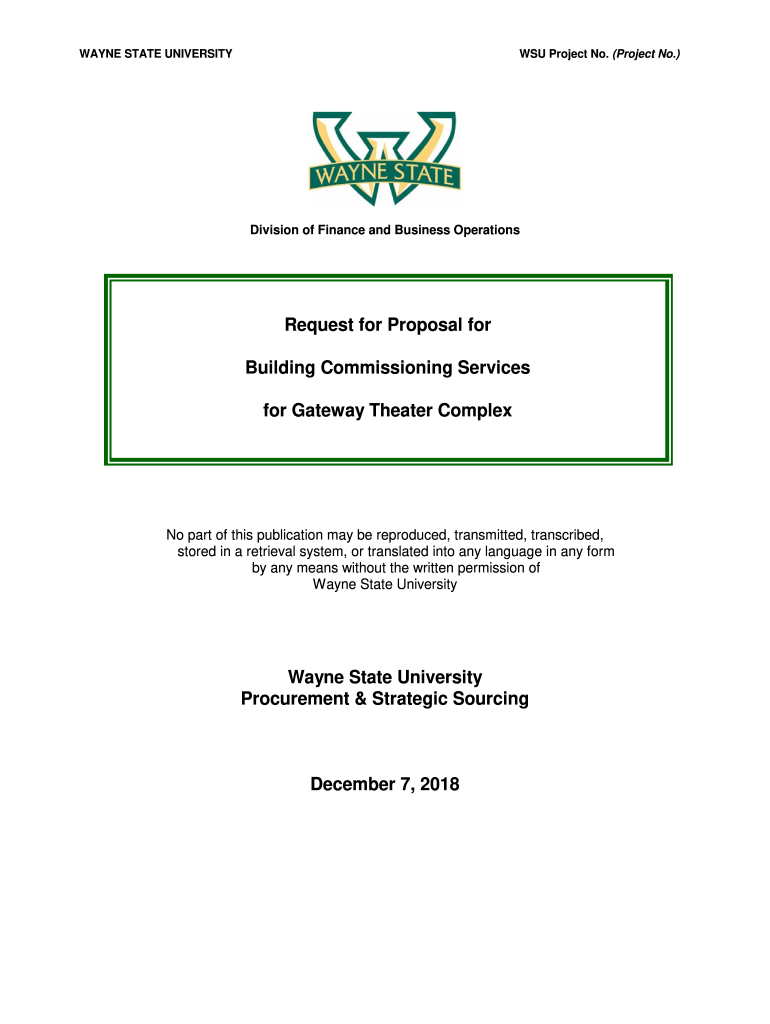 WAYNE STATE UNIVERSITY WSU Project No. (Project No.) Division of Finance and Business OperationsRequest for Proposal for Building Commissioning Services for Gateway Theater Complex No part of this