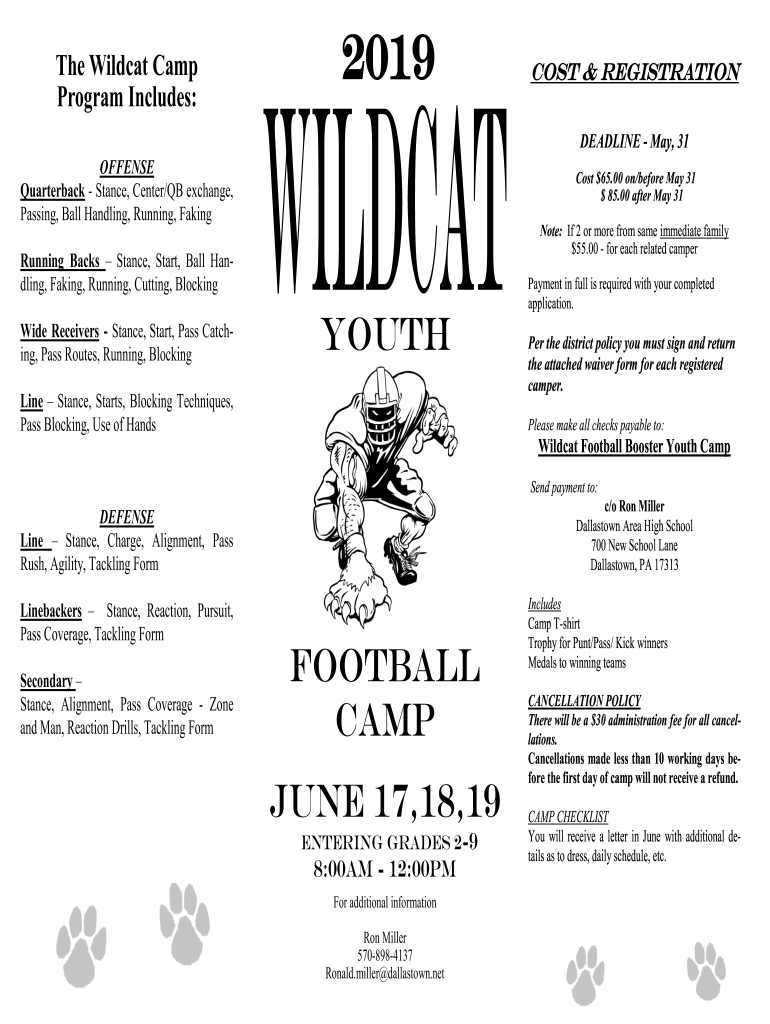 The Wildcat Camp Program Includes:2019Cost & Registration DEADLINE May, 31OFFENSE Quarterback Stance, Center/QB exchange, Passing, Ball Handling, Running, FakingCost $65.00 on/before May $31 85.00