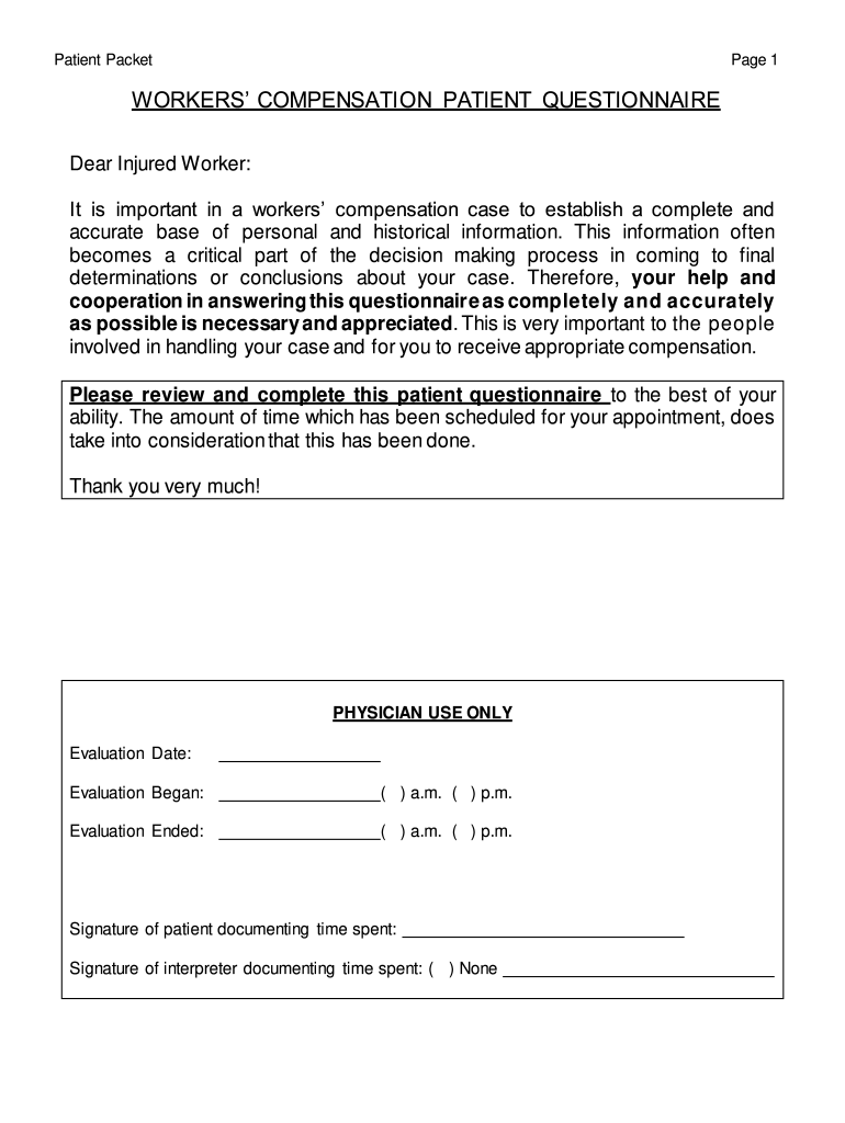Patient Packet Page 1WORKERS COMPENSATION PATIENT QUESTIONNAIRE
