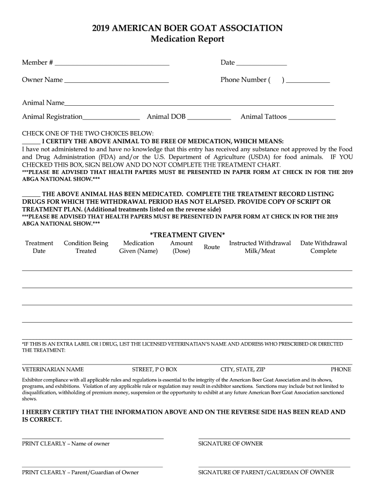 2019 AMERICAN BOER GOAT ASSOCIATION Medication Report Member # Date Owner Name Phone Number () Animal Name Animal Registration Animal DOB Animal Tattoos CHECK ONE OF THE TWO CHOICES BELOW: I CERTIFY