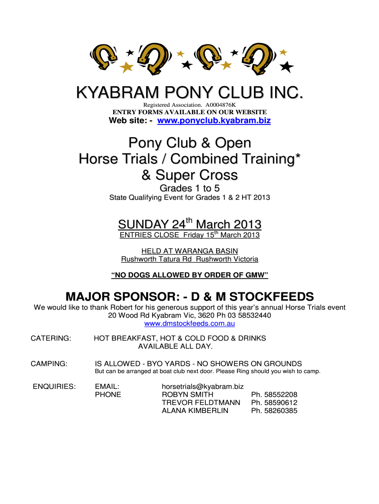 ABRAM PONY CLUB INC. Registered Association. A0004876KENTRY FORMS AVAILABLE ON OUR WEBSITE: www.ponyclub.kyabram.bizPony Club & Open Horse Trials / Combined Training* & Super Cross Grades 1 to 5 State