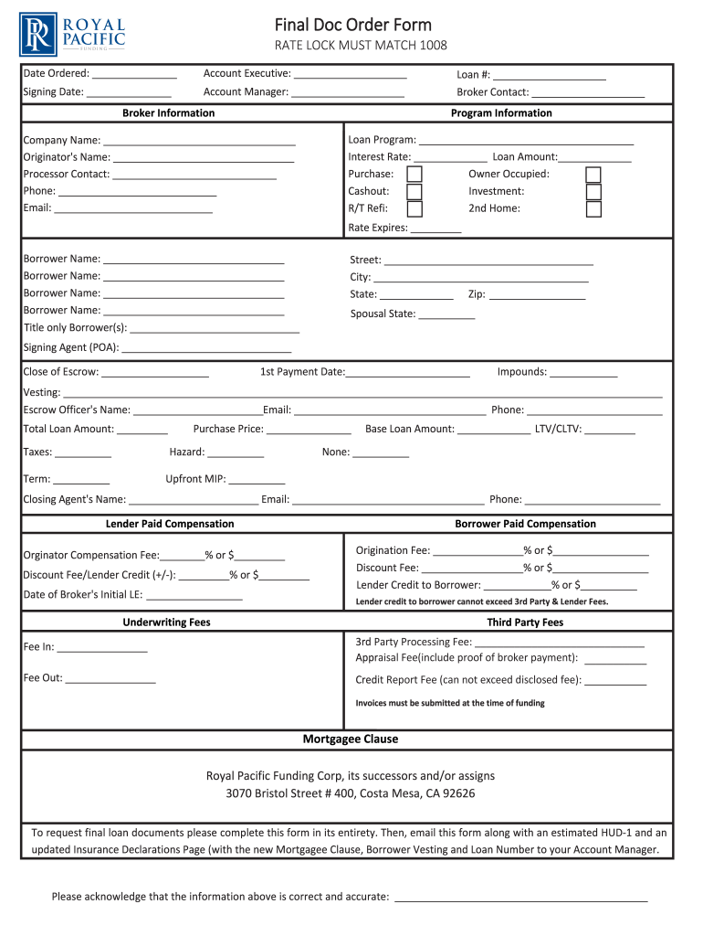 The final doc order form is a document used to request the finalization of order documentation related to a specific transaction or service.