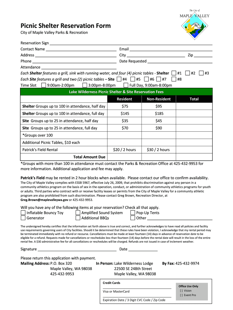 Picnic Shelter Reservation Form City of Maple Valley Parks & RecreationReservation Sign Contract Name Email Address City Phone Date Requested Attendance Each Shelter features a grill, sink with running