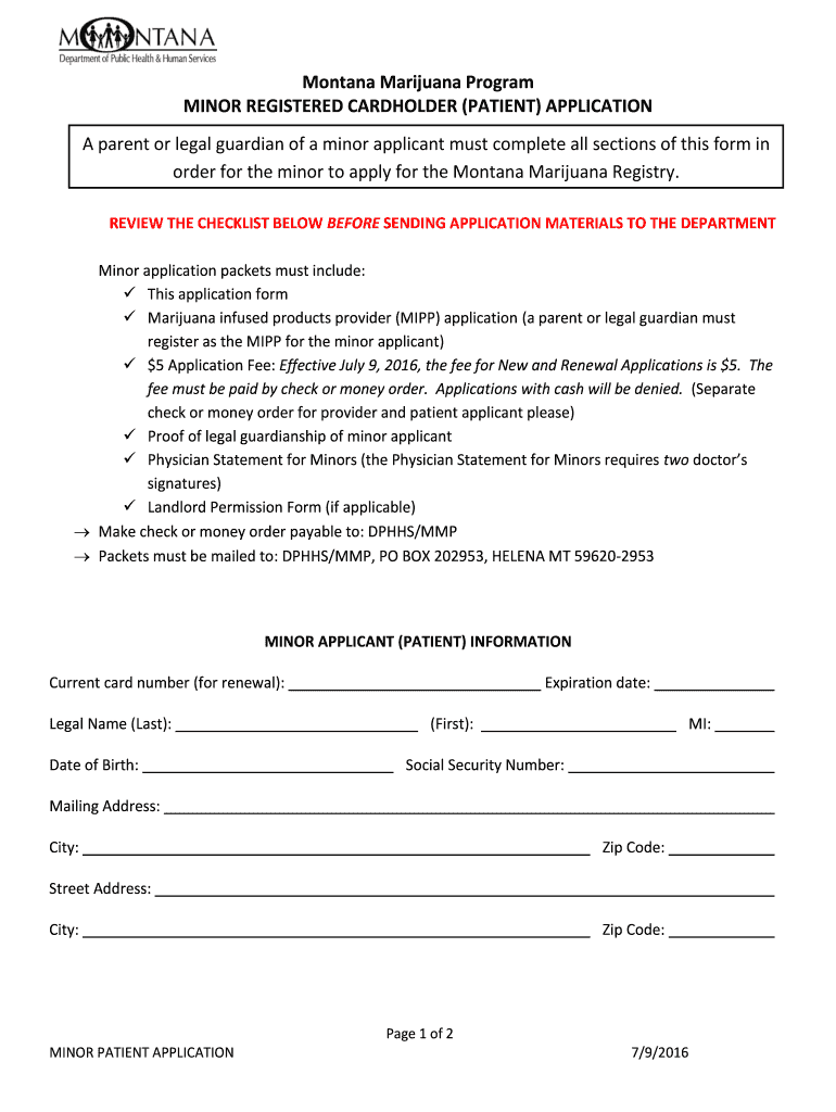 Montana Marijuana Program MINOR REGISTERED CARDHOLDER (PATIENT) APPLICATION A parent or legal guardian of a minor applicant must complete all sections of this form in order for the minor to apply