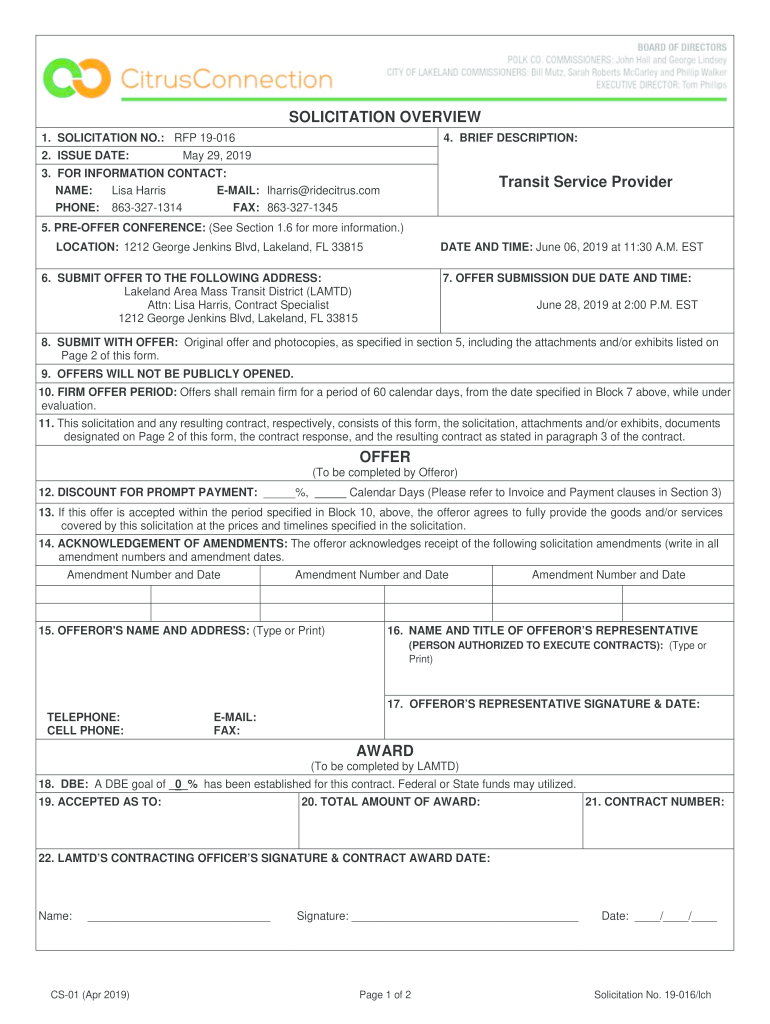 2. ISSUE DATE:4. BRIEF DESCRIPTION:May 29, 20193. FOR INFORMATION CONTACT: