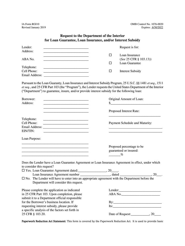 IA Form RGI10 Revised January 2019OMB Control No. 10760020 Expires: 6/30/2022Request to the Department of the Interior for Loan Guarantee, Loan Insurance, and/or Interest Subsidy Lender: Address: