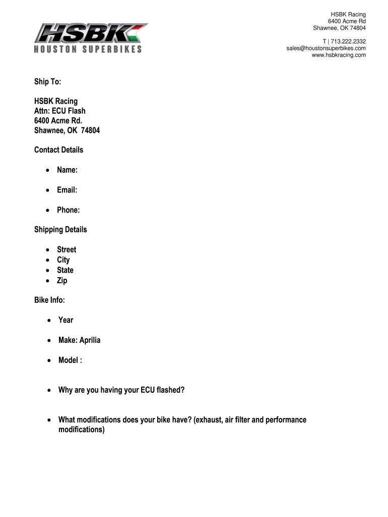 HSBC Racing 6400 Acme Rd Shawnee, OK 74804 T 713.222.2332 sales houstonsuperbikes.com www.hsbkracing.comShip To: HSBC Racing Attn: ECU Flash 6400 Acme Rd. Shawnee, OK 74804 Contact Details Name: Email: