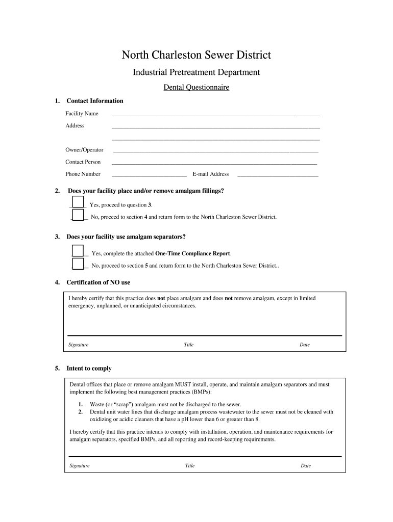 North Charleston Sewer District Industrial Pretreatment Department Dental Questionnaire 1. Contact Information Facility Name Address 2. Owner/Operator Contact Person Phone Number Email Address Does