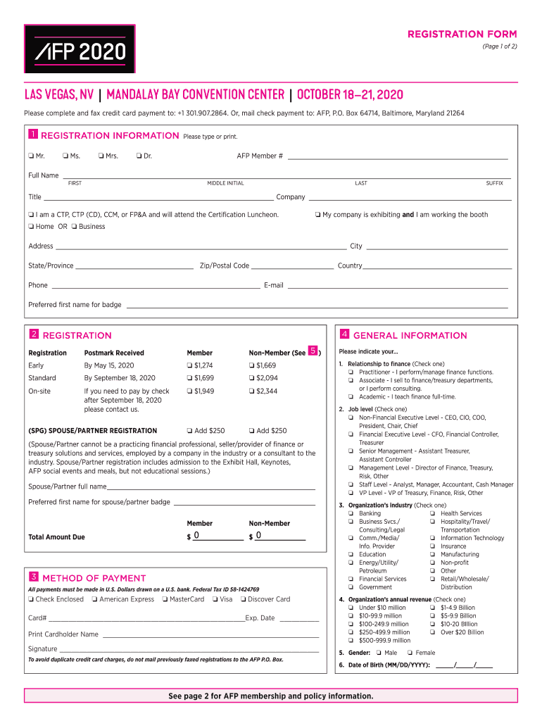 REGISTRATION FORM (Page 1 of 2)LAS VEGAS, NV MANDALAY BAY CONVENTION CENTER OCTOBER 1821, 2020 Please complete and fax credit card payment to: +1 301.907.2864. Or, mail check payment to: AFP, P.O.
