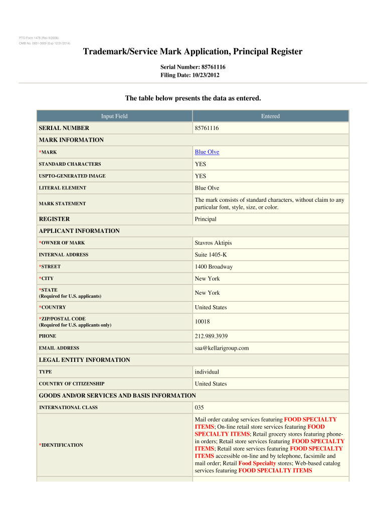 OMB No. 06510009 (Exp 12/31/2014)Trademark/Service Mark Application, Principal Register