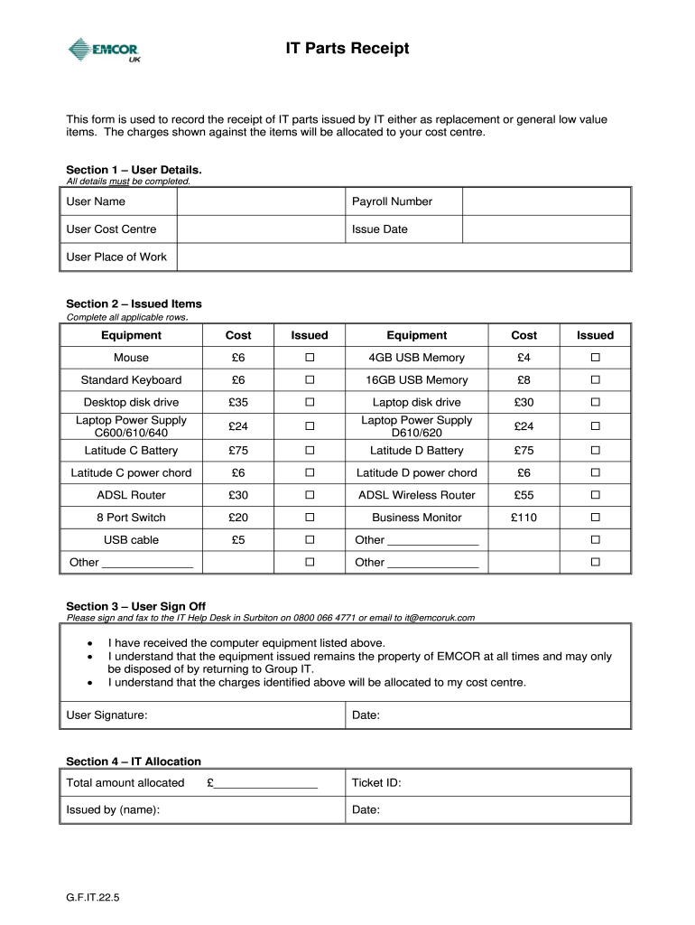 IT Parts Receipts form is used to record the receipt of IT parts issued by IT either as replacement or general low value items. The charges shown against the items will be allocated to your cost center.