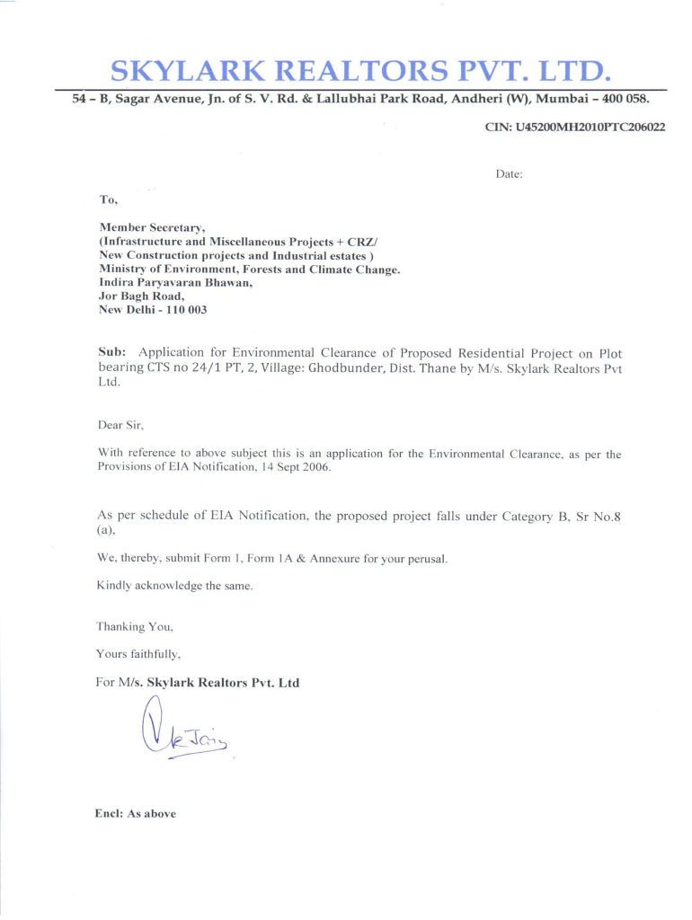 Environmental Clearance For Proposed Residential Building Skylark Realtors Pvt Ltd. At Plot bearing CTS no 24/1 PT,2, Village: Grounder, Dist. Thane, Maharashtra Skylark Realtors Pvt Ltd. FORM 1Residential