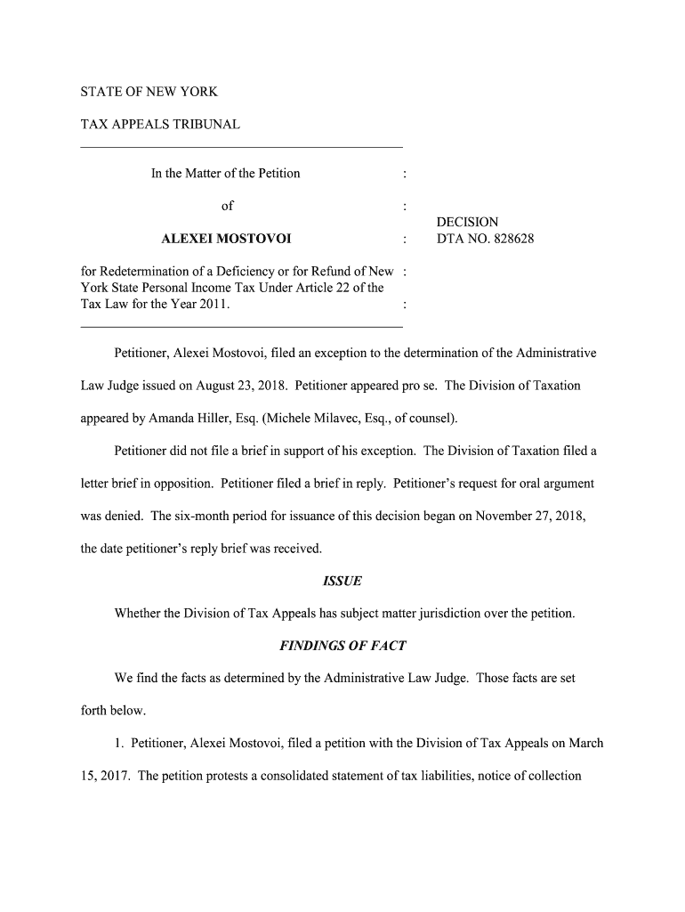 STATE OF NEW YORK TAX APPEALS TRIBUNAL In the Matter of the Petition:of:ALEXEI MISTOOK:DECISION DTA NO. 828628for Redetermination of a Deficiency or for Refund of New : York State Personal Income
