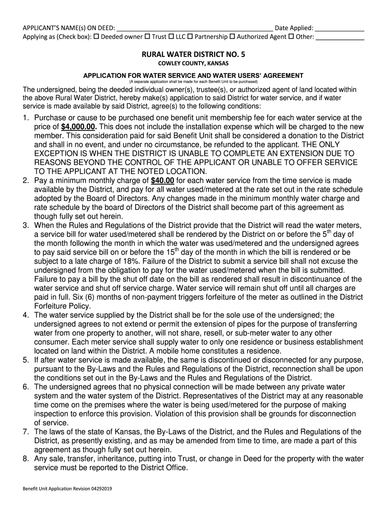 APPLICANTS NAME(s) ON DEED: Date Applied: Applying as (Check box): Deeded owner Trust LLC Partnership Authorized Agent Other:RURAL WATER DISTRICT NO. 5 COWLEY COUNTY, KANSAS APPLICATION FOR WATER