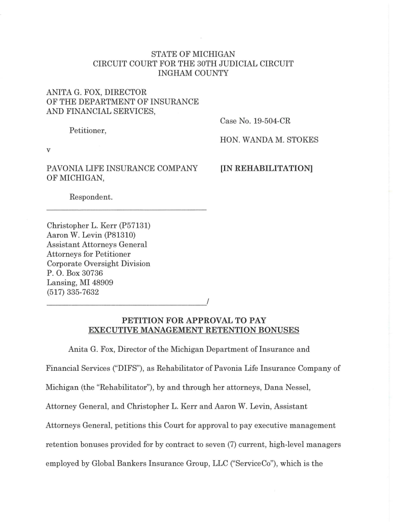 STATE OF MICHIGAN CIRCUIT COURT FOR THE 30TH JUDICIAL CIRCUIT INGHAM COUNTY ANITA G. FOX, DIRECTOR OF THE DEPARTMENT OF INSURANCE AND FINANCIAL SERVICES, Case No. 19504CR Petitioner, HON. WANDA. STOKES