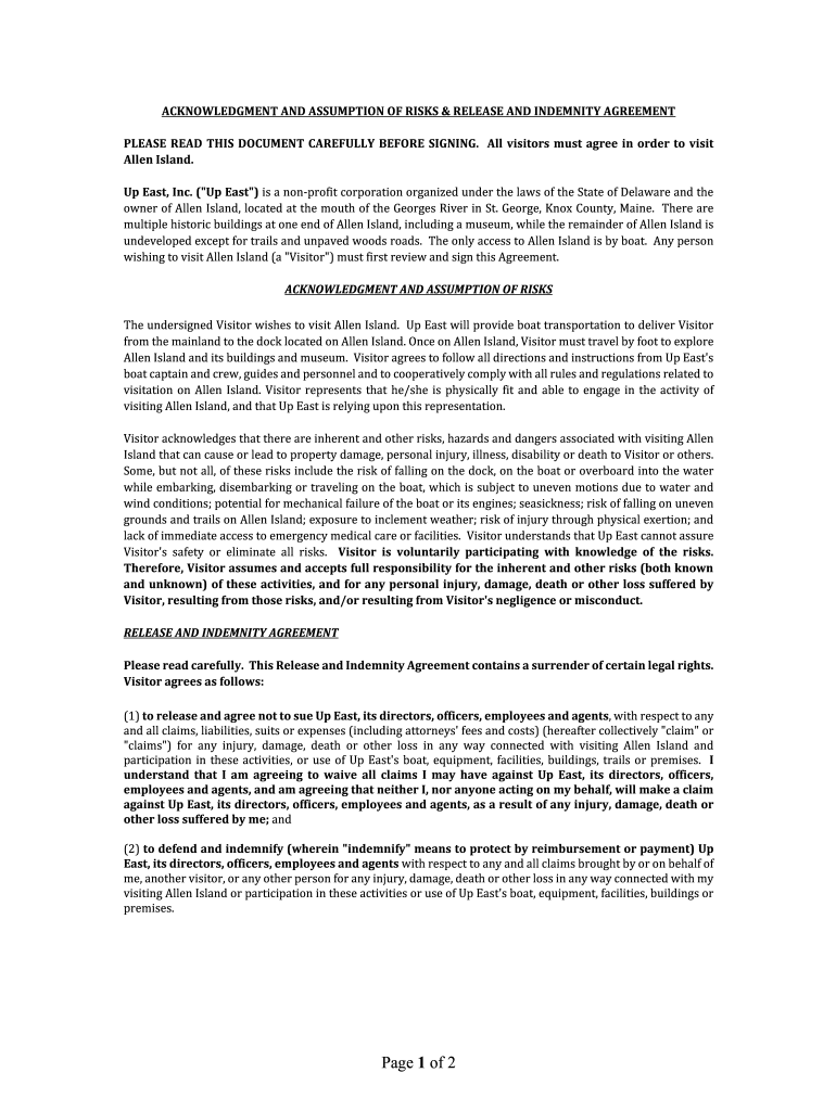 ACKNOWLEDGMENT AND ASSUMPTION OF RISKS & RELEASE AND INDEMNITY AGREEMENTPLEASEREADTHISDOCUMENTCAREFULLYBEFORESIGNING. AllvisitorsmustagreeinordertovisitAllen Island. Up East, Inc. (“Up East “)