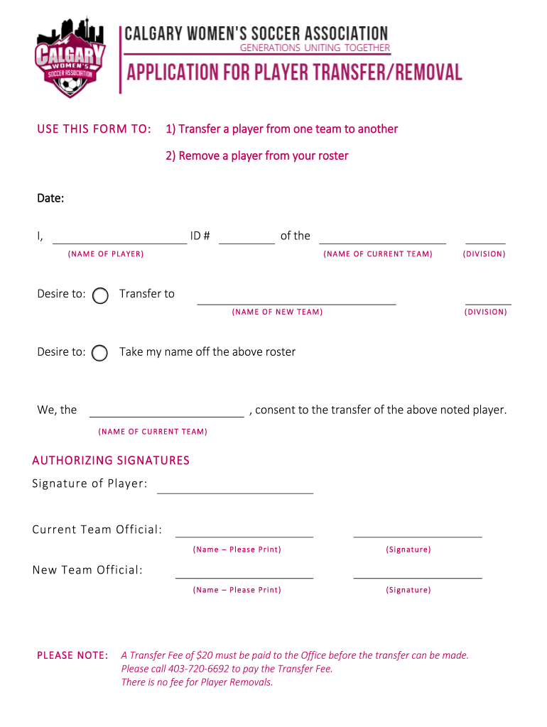 Get the free USE THIS FORM TO: 1) Transfer a player from one team to ...