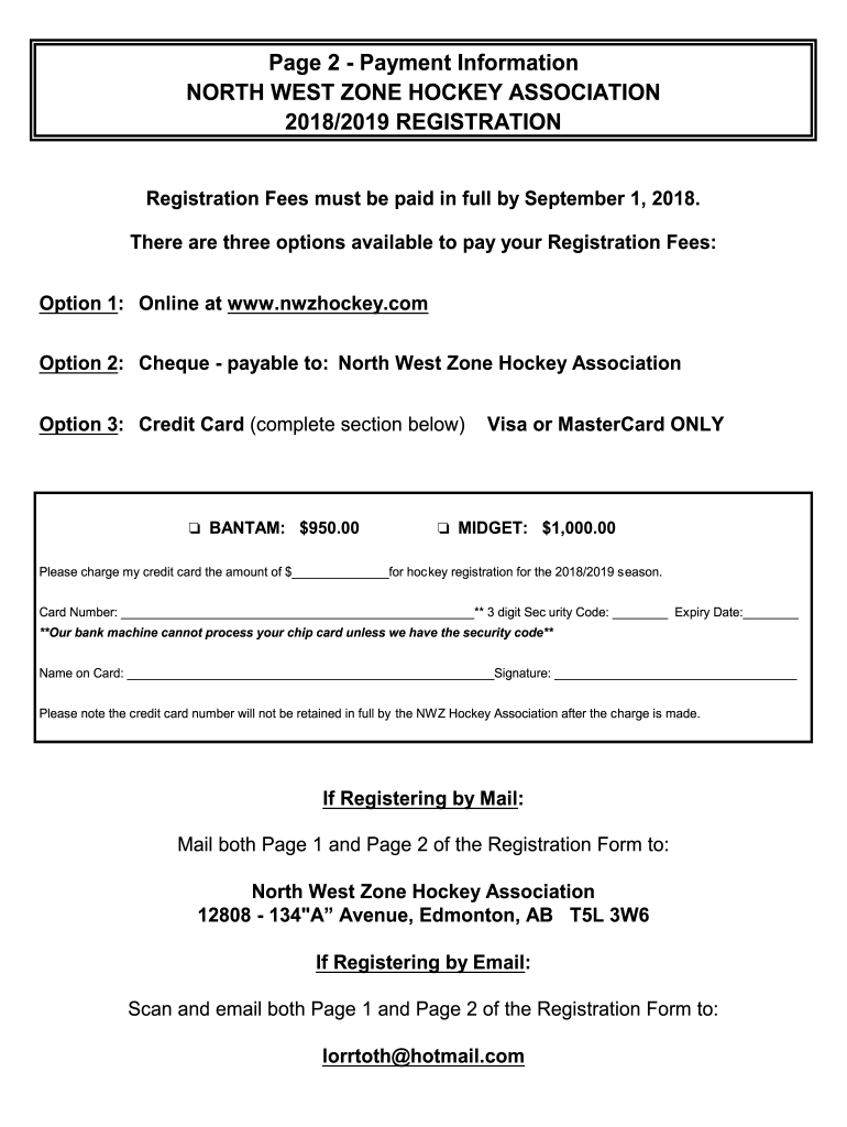 Page 2 Payment Information NORTH WEST ZONE HOCKEY ASSOCIATION 2018/2019 REGISTRATION Fees must be paid in full by September 1, 2018. There are three options available to pay your Registration Fees: