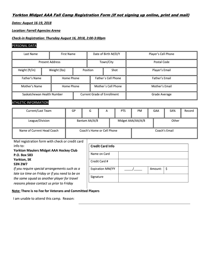 Get the free Yorkton Midget AAA Fall Camp Registration Form (If not ...