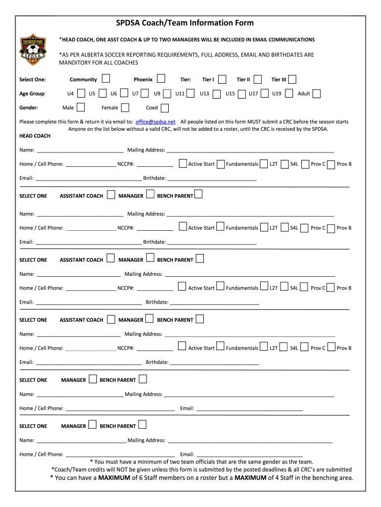 SP DSA Coach/Team Information Form *HEAD COACH, ONE ASST COACH & UP TO TWO MANAGERS WILL BE INCLUDED IN EMAIL COMMUNICATIONS *AS PER ALBERTA SOCCER REPORTING REQUIREMENTS, FULL ADDRESS, EMAIL AND