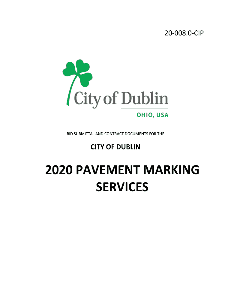 20008.0CIP BIDSUBMITTALANDCONTRACTDOCUMENTSFORTHE CITYOFDUBLIN 2020PAVEMENTMARKING SERVICES TABLE OF CONTENTS I.II.BIDDING REQUIREMENTS ............................................................................................