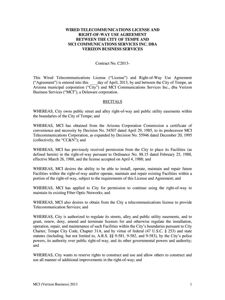 WIRED TELECOMMUNICATIONS LICENSE AND RIGHTOFWAY USE AGREEMENT BETWEEN THE CITY OF TEMPE AND MCI COMMUNICATIONS SERVICES INC. DBA VERIZON BUSINESS SERVICESContract No. C2013This Wired Telecommunications