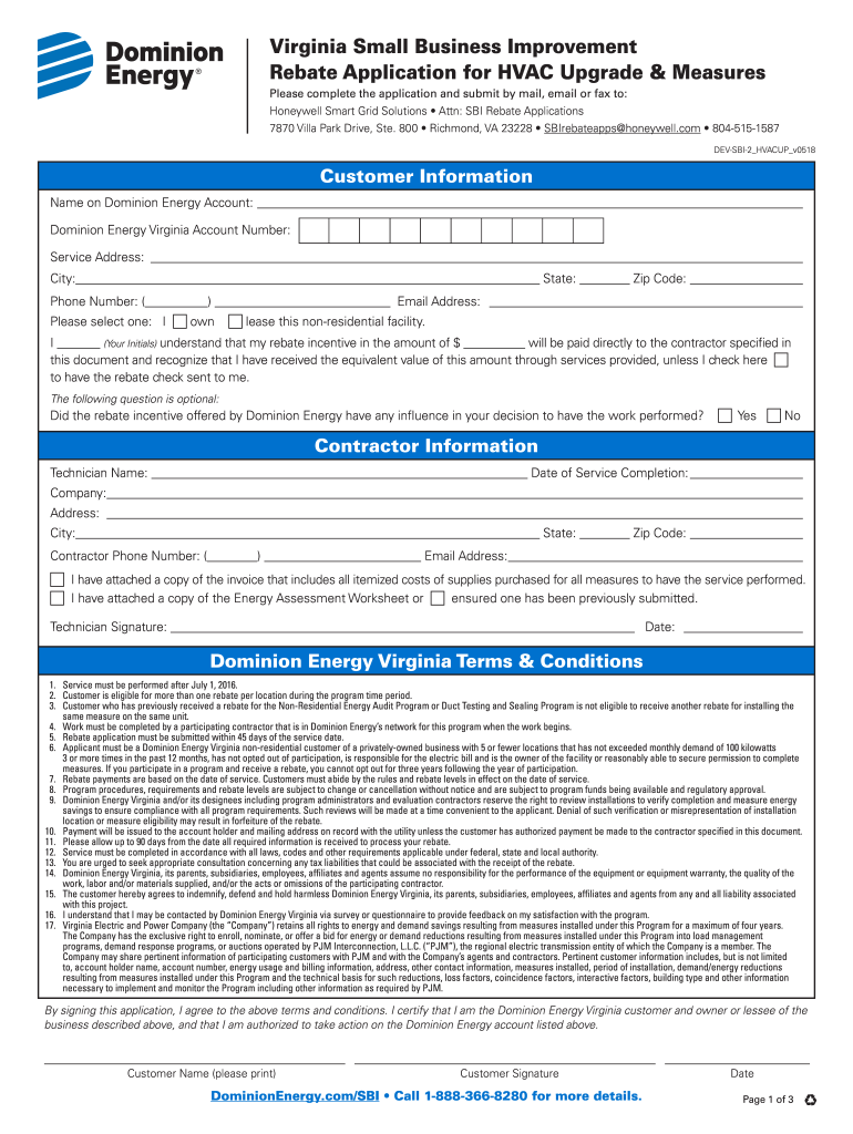 Virginia Small Business Improvement Rebate Application for HVAC Upgrade & Measures Please complete the application and submit by mail, email or fax to: Honeywell Smart Grid Solutions Attn: SBI Rebate