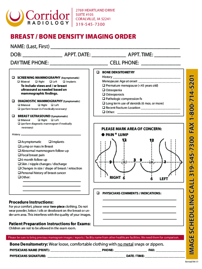 The primary audience for this form includes healthcare providers such as physicians and medical institutions. Additionally, patients requiring breast or bone density imaging procedures will need to have this form completed. Understanding specific eligibility criteria is also vital for ensuring proper usage of the form during the imaging appointment process.