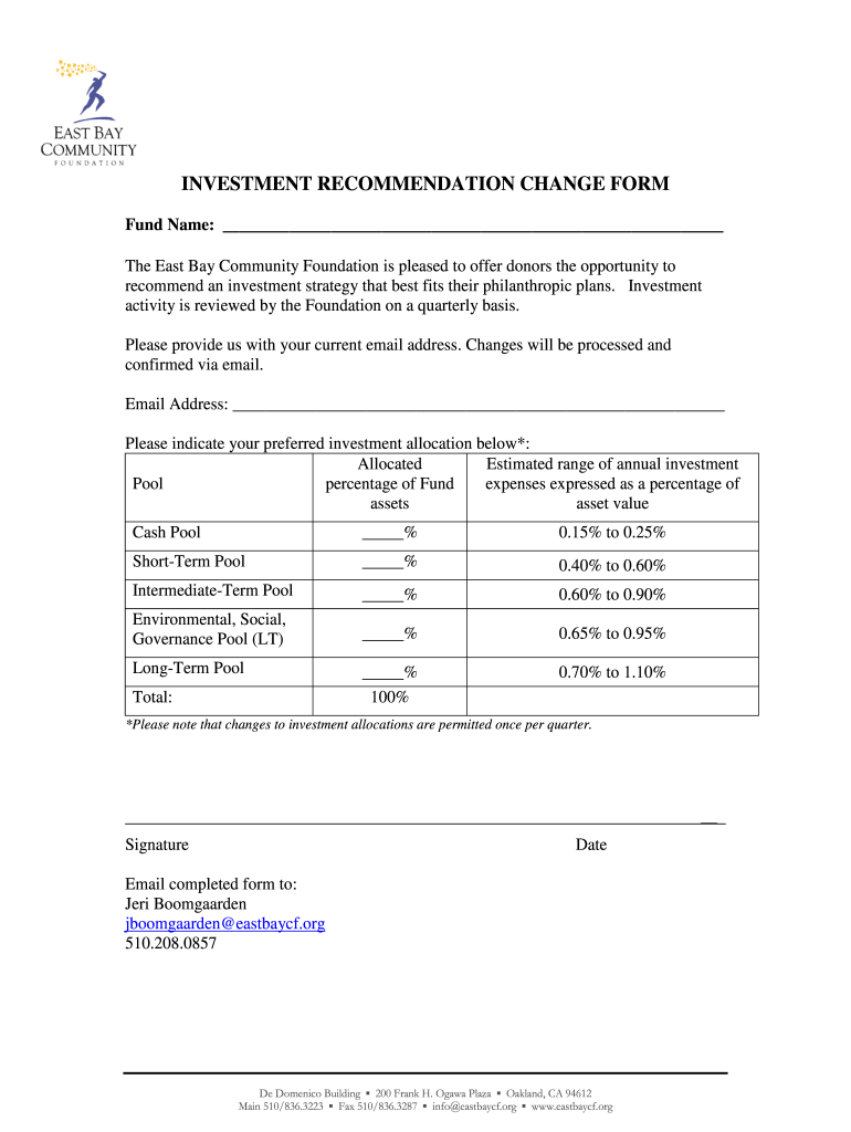 INVESTMENT RECOMMENDATION CHANGE FORM Fund Name: The East Bay Community Foundation is pleased to offer donors the opportunity to recommend an investment strategy that best fits their philanthropic