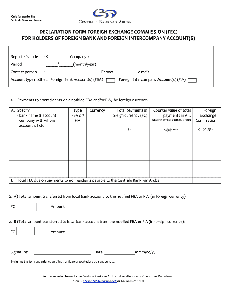 Only for use by the Central Bank van ArubaDECLARATION FORM FOREIGN EXCHANGE COMMISSION (FEC) FOR HOLDERS OF FOREIGN BANK AND FOREIGN INTERCOMPANY ACCOUNT(S)Reporters code: X Company : Period: / (month/year)Contact
