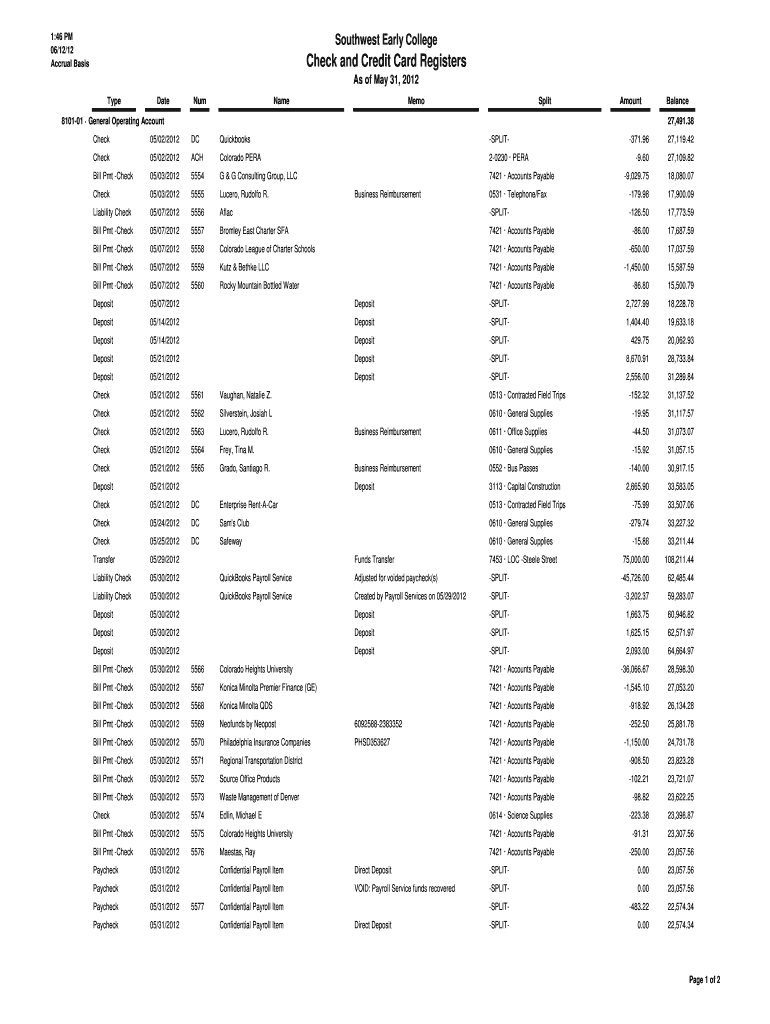 1:46 PM 06/12/12 Accrual Basis Southwest Early CollegeCheck and Credit Card Registers As of May 31, 2012 TypeDateNumNameMemoSplitAmount810101 General Operating AccountBalance 27,491.38Check05/02/2012DCQuickbooksSPLITCheck05/02/2012ACHColorado