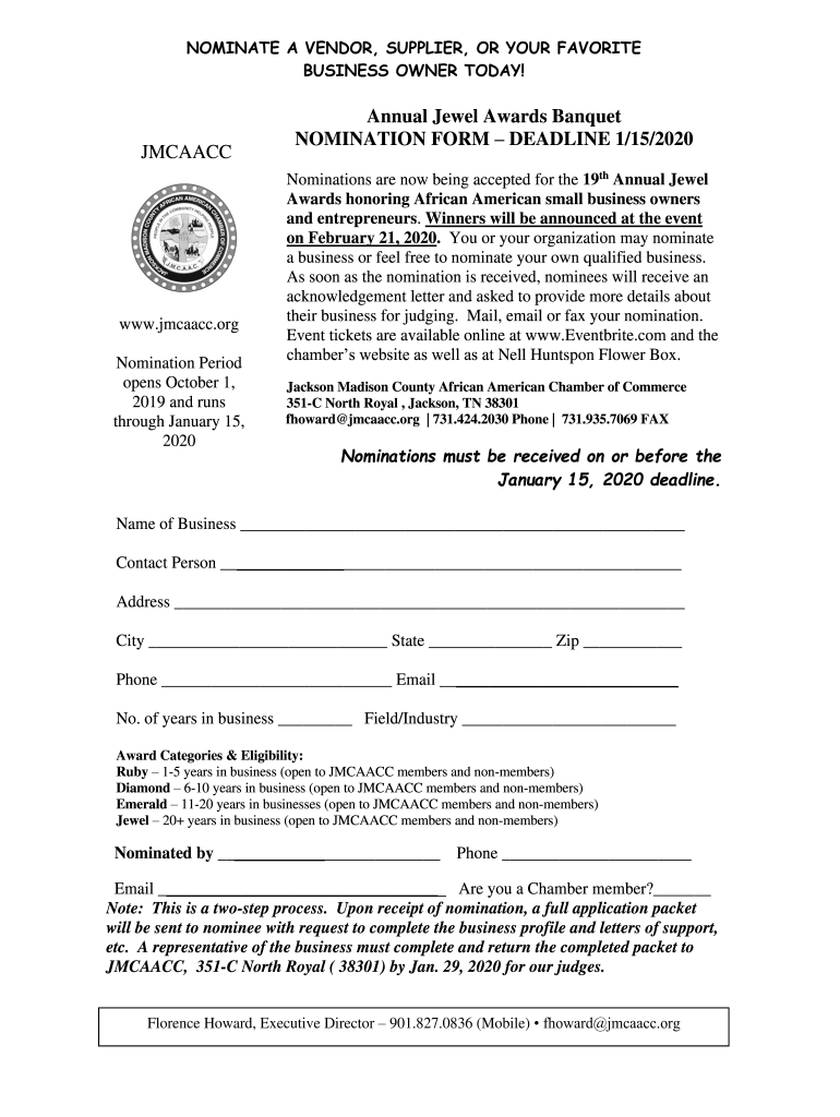 NOMINATE A VENDOR, SUPPLIER, OR YOUR FAVORITE BUSINESS OWNER TODAY!JMCAACCwww.CAAC.org Nomination Period opens October 1, 2019, and runs through January 15, 2020Annual Jewel Awards Banquet NOMINATION