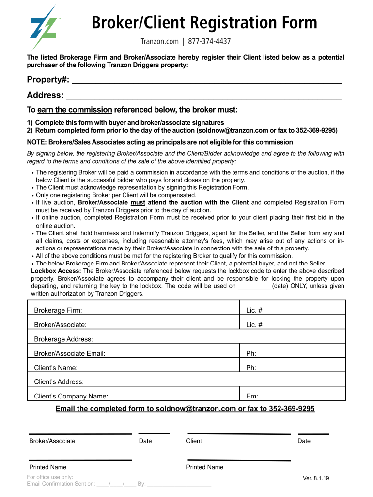 Broker/Client Registration Form Tranzon.com 8773744437 The listed Brokerage Firm and Broker/Associate hereby register their Client listed below as a potential purchaser of the following Brandon Triggers
