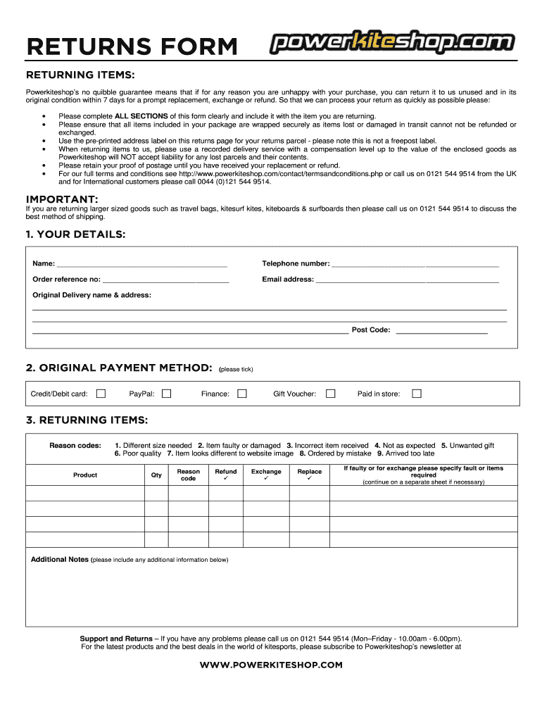 Get the free Powerkiteshop Return Form