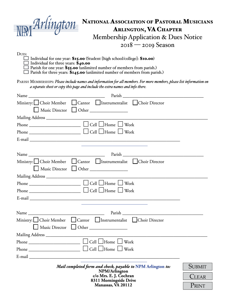 National Association of Pastoral Musicians Arlington, VA ChapterMembership Application & Dues Notice 2018 2019 Seasons:Individual for one year: $15.00 (Student high school/college : $10.00) Individual