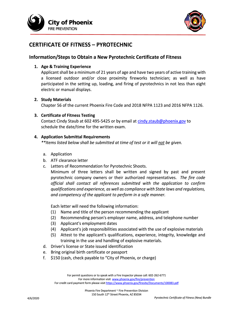 CERTIFICATE OF FITNESS PYROTECHNIC Information/Steps to Obtain a New Pyrotechnic Certificate of Fitness 1. Age & Training Experience Applicant shall be a minimum of 21 years of age and have two years