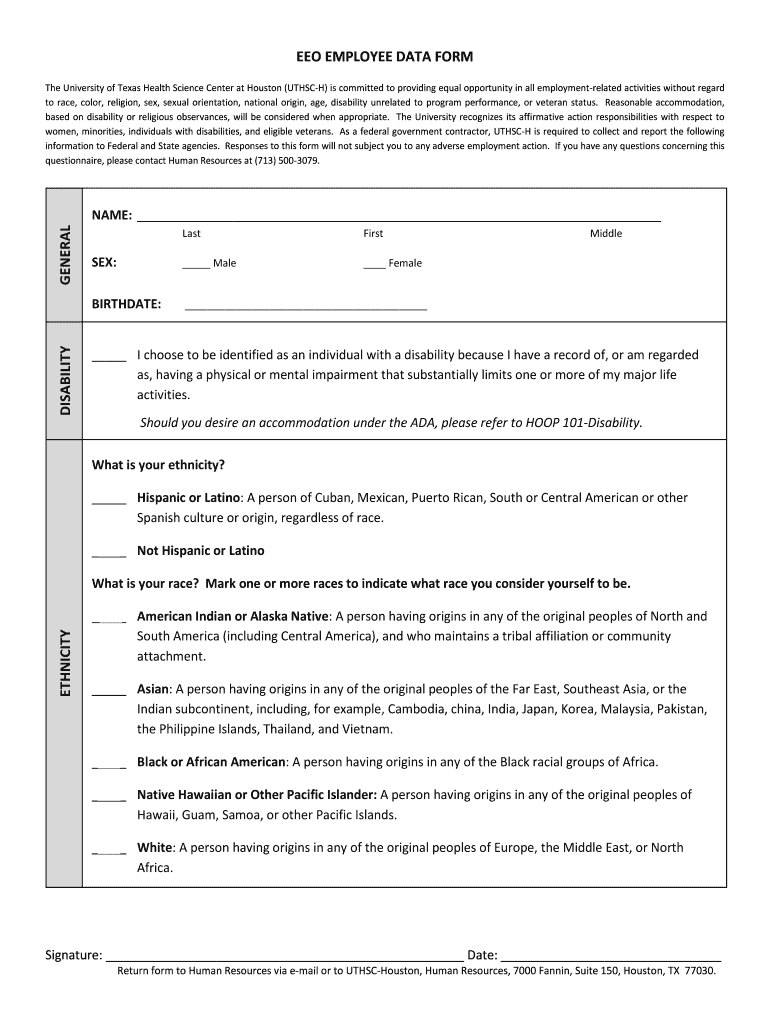 The EEO Employee Data Form is an employment document used by employees at UTHSC-H to provide demographic information for federal and state reporting purposes.