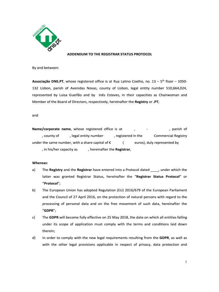 ADDENDUM TO THE REGISTRAR STATUS PROTOCOL By and between: Associate DNS.PT, whose registered office is at RUA Latino Coelho, no. 13 5th floor 1050132 Lisbon, parish of Agendas Novas, county of Lisbon,
