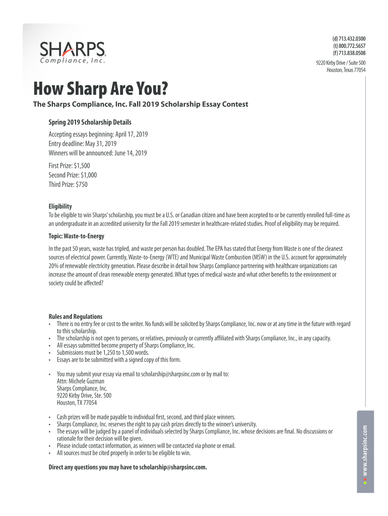 Houston, Texas 77054How Sharp Are You? The Sharps Compliance, Inc. Fall 2019 Scholarship Essay Contest